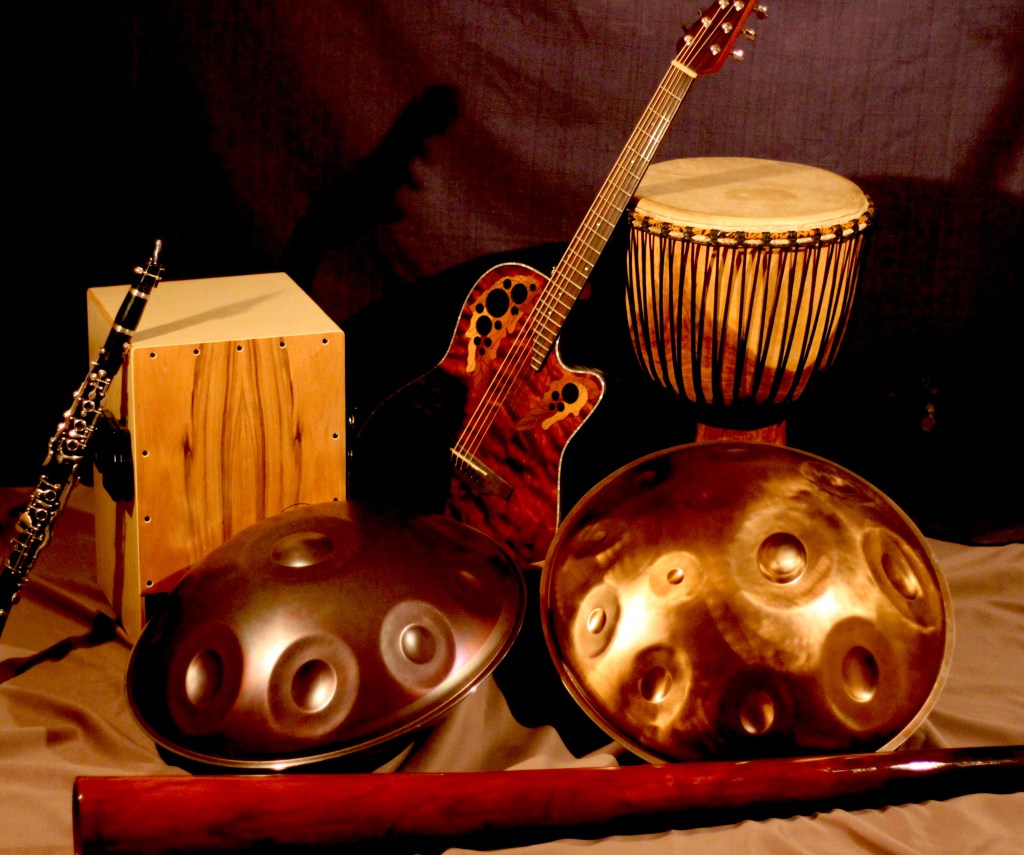 Wir spielen insgesamt etwa 9 verschiedene Instrumente darunter verschiedene Handpans, Didgeridoos, Gitarre, Klarinette, Djembé, Cajon und kleinere Percussion-Instrumente. Die kreierten Klänge werden dadurch sehr vielseitig und abwechslungsreich.